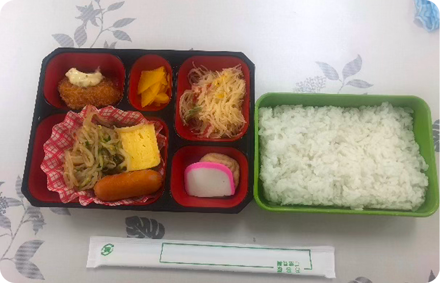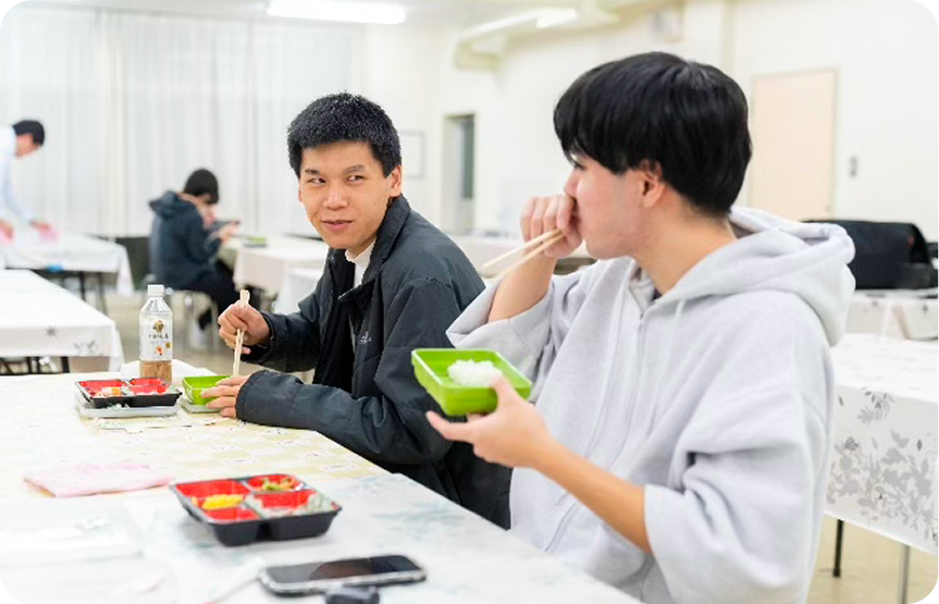 夜間定時制課程では、授業が夜にまで及ぶため、給食の時間を設けています。本校では弁当給食を提供し、全学年が食堂で食事をとります。