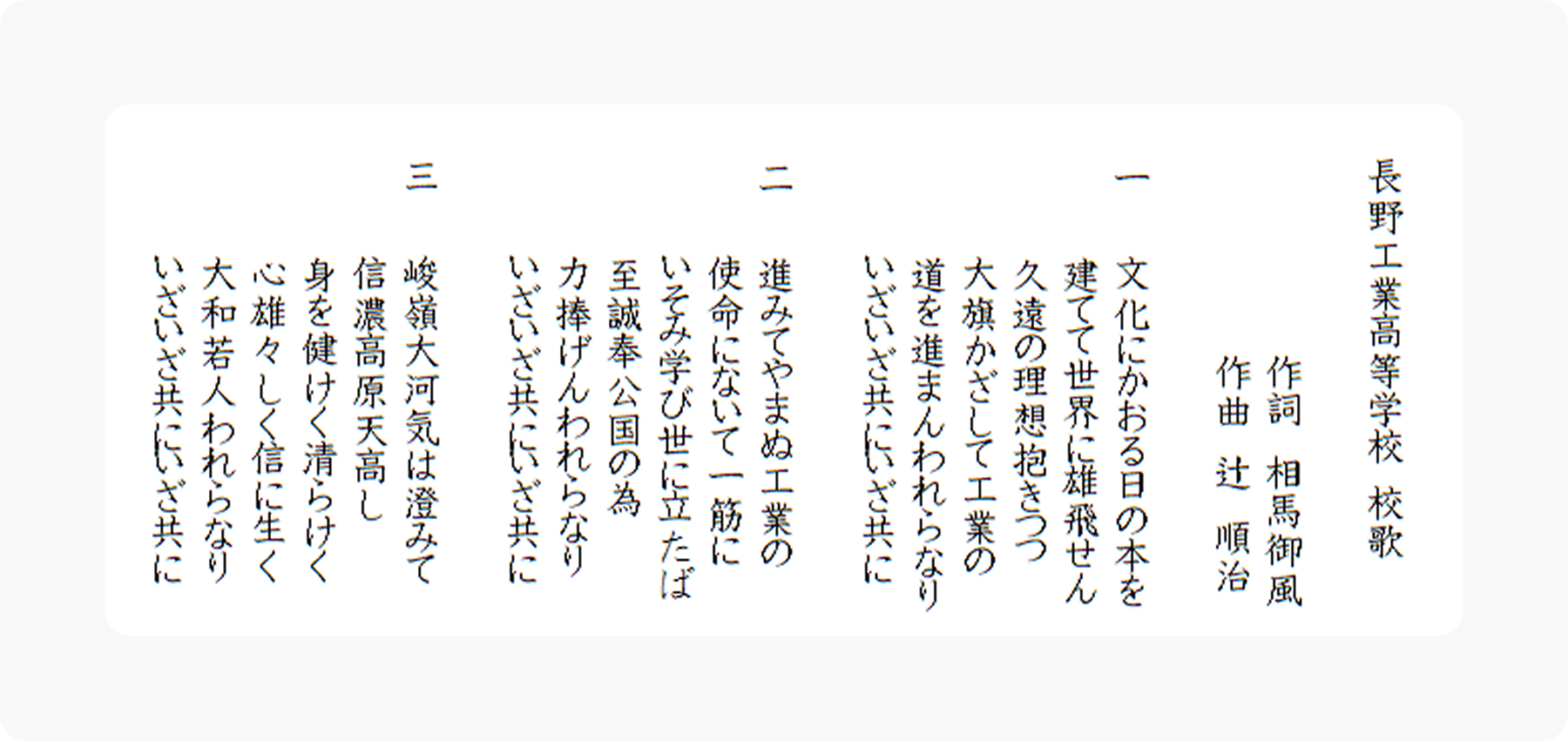 | 大正7年4月 | 長野県立工業学校として長野市岡田町に開校。機械電気科・応用化学科(4ヶ年科) |